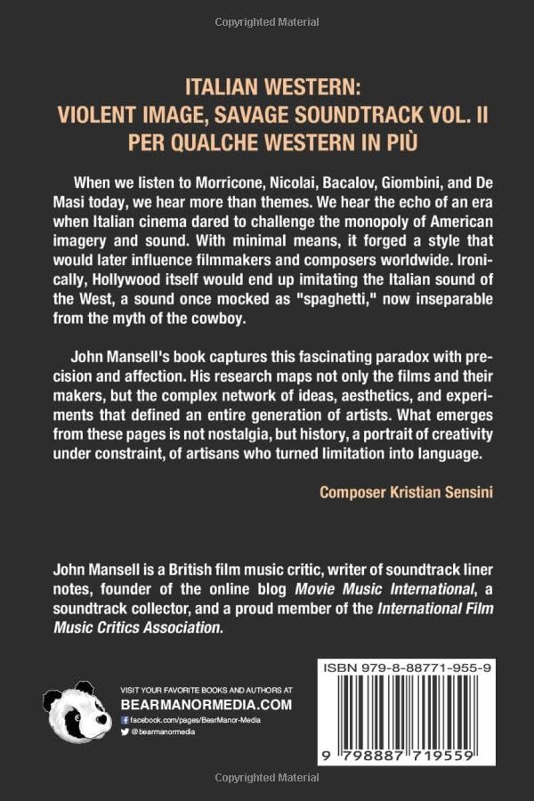 "I must admit I must have led a sheltered life for whilst obsessed with film music for most of my adult life- wrongly as it turned out, but that is another story - Italian Westerns and their music escaped me, even when films like THE GOOD, THE BAD AND THE UGLY, THE BIG GUNDOWN etc, were in the Movie Houses. So John Mansell's second tome on this highly popular and ultimately interesting genre is a welcome breath of fresh air after soaking up endless discussions on John Williams, John Barry, et al. The book is truly amazing, I was fascinated by stories, composers and films I must be honest and say I had never heard of. Loads of information, photos and facts, full of interesting material you can't stop going back and dipping into John Mansell is one of the great unsung heroes of film music, not getting the recognition he so rightly deserves. I have known him since the late 60s, and his love of film music has never left him; he has never wavered like me now and then. His knowledge is encyclopedic, as these two books and his book on Hammer Film music will testify. The big plus of any book on music, whatever it is, is that once read, you feel you want to search the music out and listen to it. I can assure you that this book delivers very heavily on that score."