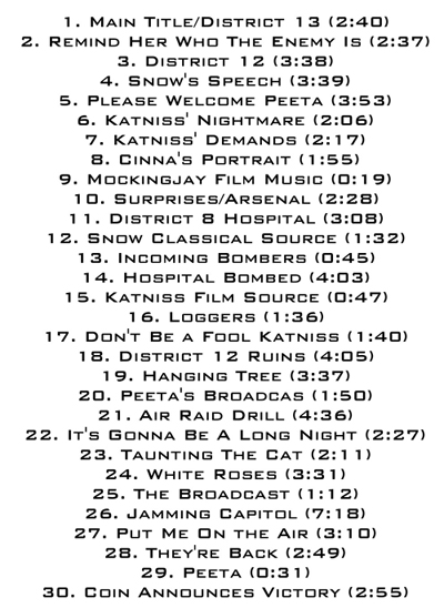 Expanded Original score from THE HUNGER GAMES: MOCKINGJAY PART 1. Contains 30 tracks, 79mins total. CD-R.