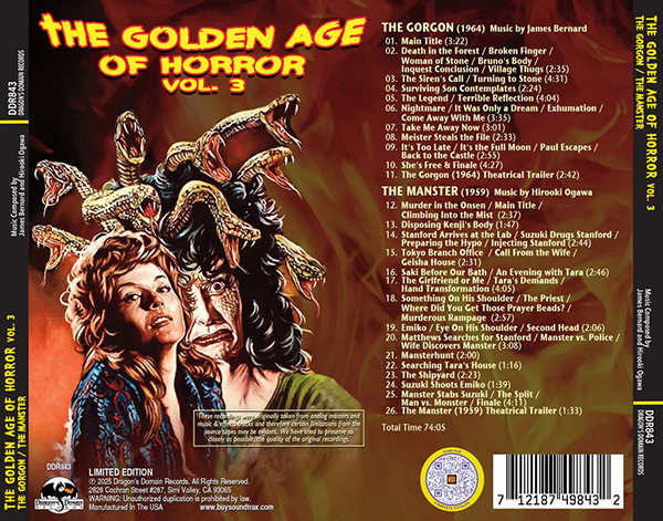 Dragon's Domain Records proudly presents the third volume in a new ongoing series of music from classic horror films from the Golden Age, featuring two world premiere releases of music from THE GORGON and THE MANSTER.