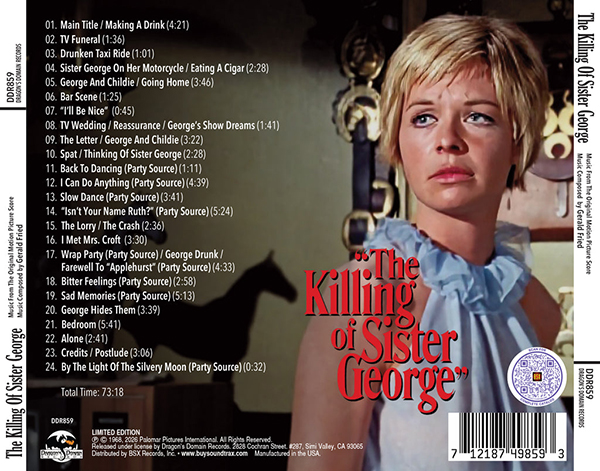 Dragon's Domain Records presents the world premiere release of THE KILLING OF SISTER GEORGE, featuring music composed by Gerald Fried. The music has been mastered by James Nelson at Digital Outland and the liner notes have been written by Scott Davis.