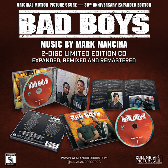 La-La Land Records and Sony Pictures celebrate the 30th Anniversary of the 1995 blockbuster big-screen action/comedy BAD BOYS, starring Will Smith and Martin Lawrence, and directed by Michael Bay, with this remixed, remastered and expanded limited edition 2-CD re-issue of acclaimed composer Mark Mancina's iconic original motion picture score.