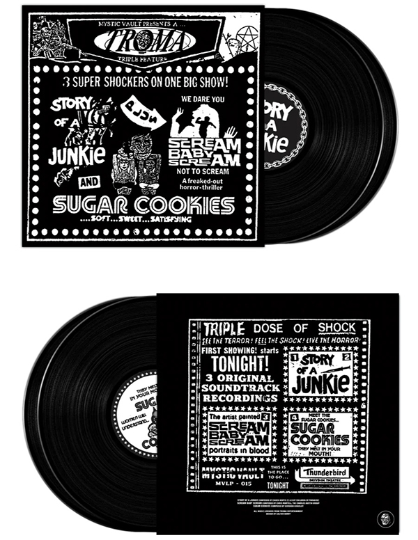 TROMA TRIPLE FEATURE: 3 FILM SOUNDTRACKS ON 2LP VINYL. FEATURING THE FILM SCORES FROM - STORY OF A JUNKIE (1985), SCREAM BABY SCREAM (1969), SUGAR COOKIES (1973). ALL MUSIC FOR THIS COMPILATION RELEASE WAS SOURCED FROM AUDIO LICENSED FROM TROMA ENTERTAINMENT. INCLUDES DOUBLE SIDED INSERT. LIMITED TO 250. *TWO DIFFERENT JACKET ARTWORK OPTIONS TO CHOOSE FROM.