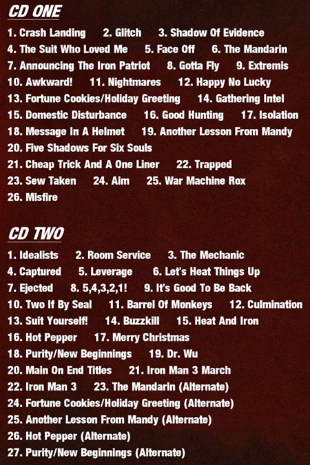 トニー・スターク=アイアンマンの“最後の戦い”を描くシリーズ第3作。レコーディング・セッションから収録したサウンドトラック完全盤!全53曲、132分収録。CD-R盤。