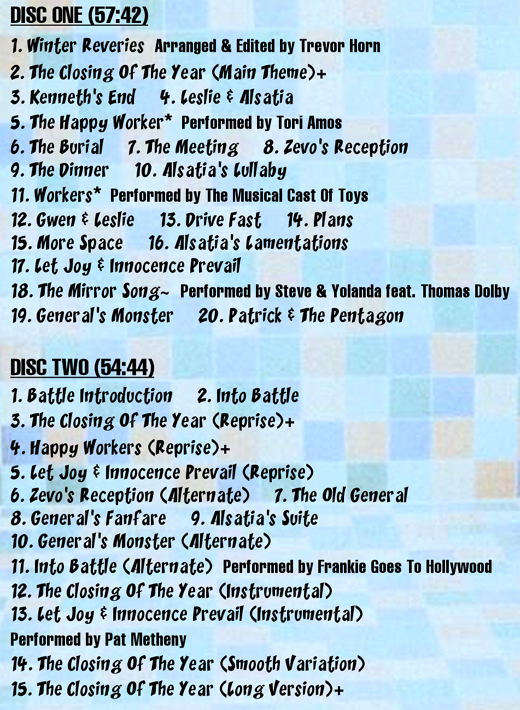 バリー・レヴィンソン監督、ロビン・ウィリアムズ主演によるファンタジー。112分半の楽曲を収録したサウンドトラック・エクスパンデッド盤!CD-R盤。個性的な工場を持つおもちゃ会社の社長が急死し、社長の兄であるバリバリの軍国主義者(元将軍)が会社を引き継ぐことになる。しかし彼は事もあろうに最新ハイテク技術を用いて超小型軍事兵器のおもちゃを開発しようとするのだった。それを知った社長の息子レスリーは阻止すべく将軍の元へ向かうのだったが……。1992年米。