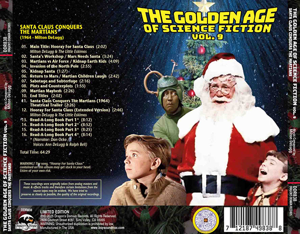 Dragon's Domain Records proudly presents the ninth volume in our ongoing series of music from classic science-fiction films, this time focusing on the world premiere release of Milton DeLugg's music for the 1964 holiday adventure comedy SANTA CLAUS CONQUERS THE MARTIANS, directed by Nicholas Webster, written by Glenville Mareth and Paul L. Jacobson, starring John Call, Leonard Hicks, Vincent Beck, Bill McCutcheon, Victor Stiles, Donna Conforti, Chris Month, Leila Martin, Charles Renn, James Cahill, Ned Wertimer, Doris Rich and Pia Zadora.