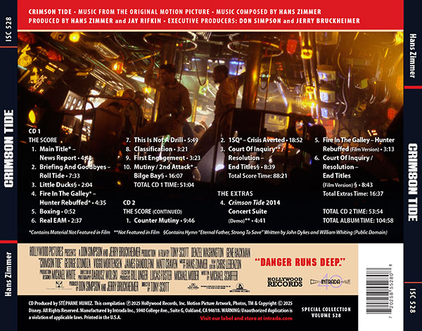 Intrada announces the 30th anniversary, two-CD set of Hans Zimmer's score for the 1995 political-action thriller Crimson Tide. Zimmer was truly flying high in his career by the mid-1990s. He had successfully made the jump from London to Hollywood and had just won an Academy AwardR for his score for The Lion King (1994). His sound was going through an evolution during the late 1980s and early 1990s, and it was on Backdraft (1991) that Zimmer fully embraced meshing an orchestra with his trademark synthesizers. It was also the start of the "power anthem" for which Zimmer would become known. Crimson Tide marks the full maturing of this style that would continue to be heard most notably in The Rock (1996) and The Peacemaker (1997). Zimmer won a GRAMMYR for Best Instrumental Composition Written for a Motion Picture or for Television for Crimson Tide. The main theme of Crimson Tide is a signature power anthem that embodies heroism and bravura, and in this expanded presentation of the score one can fully appreciate how it's used throughout the narrative. The score is a master class in tension building. Zimmer utilizes atmospheric sounds to build a sonic tomb around the characters. Sounds resembling sonar, metallic colors and puffing woodwinds create sustained tension that slowly rises.