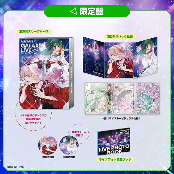 ① 特典ブルーレイディスク<DISC内容> ※日替わり曲のみ5.1chサラウンド対応・7月26日(土)公演・日替わり曲 [収録楽曲] インフィニティ 私の彼はパイロット 蒼のエーテル 妖精 ダイアモンド クレバス ホシキラ dシュディスタb Get it on ~光速クライmax・バックステージスペシャルメイキング・スペシャルインタビュー (1)May’nソロインタビュー (2)中島愛ソロインタビュー (3)May’n×中島愛 対談インタビュー (4)May’n×中島愛×菅野よう子×佐々木史朗 座談会・シェリル・ノーム誕生日記念「マクロスF ギャラクシーライブ☆ファイナル 2025」を振り返ろう? ダイジェスト② ライブフォト収録ブック③ 三方背スリーブケース&デジパック仕様<セットリスト/Kアリーナ横浜 2025.7.27公演>01. サクリファイス02. 時の迷宮03. トライアングラー(fight on stage)04. Welcome To My FanClub's Night!05. What 'bout my star?06. ノーザンクロス07. 射手座☆午後九時Don't be late08. アイモ?鳥のひと09. ねこ日記10. アナタノオト11. 星間飛行12. What 'bout my star?@Formo13. デカルチャー歌合戦メドレー14. そうだよ。15. 永遠16. ユニバーサル・バニー17. 虹いろ・クマクマ18. オベリスク19. 放課後オーバーフロウ20. サヨナラノツバサ ~the end of triangle21. ライオン<アンコール>22. ダイアモンド クレバス with 菅野よう子23. Songbird with 菅野よう子24. 娘々サービスメドレー with 菅野よう子