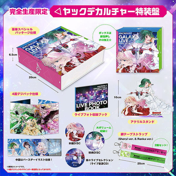<完全生産限定・ヤックデカルチャー特装盤 特典内容>①特典ブルーレイディスク<DISC内容> ※日替わり曲のみ5.1chサラウンド対応・オーディオコメンタリー付【DAY1】 DAILY SONGS -日替わり曲- インフィニティ 私の彼はパイロット 蒼のエーテル 妖精 ダイアモンド クレバス ホシキラ dシュディスタb Get it on ~光速クライmax・バックステージスペシャルメイキング・スペシャルインタビュー (1)May’nソロインタビュー (2)中島愛ソロインタビュー (3)May’n×中島愛 対談インタビュー (4)May’n×中島愛×菅野よう子×佐々木史朗 座談会・シェリル・ノーム誕生日記念「マクロスF ギャラクシーライブ☆ファイナル 2025」を振り返ろう? ダイジェスト② ライブフォト収録ブック③「マクロスF ギャラクシーライブ☆ファイナル 2025」娘々ライブセレクション(ライブ音源CD)TRACKLIST 01. トライアングラー(fight on stage) 02. Welcome To My FanClub's Night! 03. ノーザンクロス 04. アイモ~鳥のひと 05. 星間飛行 06. What 'bout my star?@Formo 07. 蒼のエーテル(DAY1) 08. 妖精(DAY1) 09. オベリスク 10. 放課後オーバーフロウ 11. サヨナラノツバサ ~the end of triangle 12. ライオン 13. ENCORE ~Prologue F~ 14. ダイアモンド クレバス with 菅野よう子 15. Songbird with 菅野よう子④ 銀テープストラップ(Sheryl ver. & Ranka ver.)2種セット⑤ アクリルスタンド⑥豪華スペシャルパッケージ仕様<セットリスト/Kアリーナ横浜 2025.7.27公演>01. サクリファイス02. 時の迷宮03. トライアングラー(fight on stage)04. Welcome To My FanClub's Night!05. What 'bout my star?06. ノーザンクロス07. 射手座☆午後九時Don't be late08. アイモ?鳥のひと09. ねこ日記10. アナタノオト11. 星間飛行12. What 'bout my star?@Formo13. デカルチャー歌合戦メドレー14. そうだよ。15. 永遠16. ユニバーサル・バニー17. 虹いろ・クマクマ18. オベリスク19. 放課後オーバーフロウ20. サヨナラノツバサ ~the end of triangle21. ライオン<アンコール>22. ダイアモンド クレバス with 菅野よう子23. Songbird with 菅野よう子24. 娘々サービスメドレー with 菅野よう子