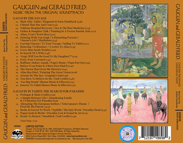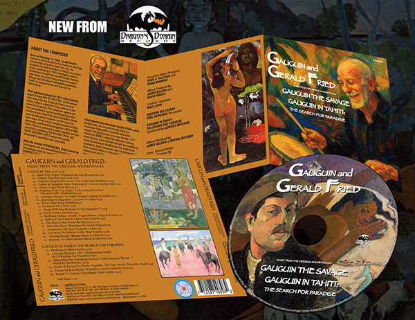 Dragon's Domain Records presents GAUGUIN AND GERALD FRIED, featuring the world premiere release of GAUGUIN THE SAVAGE and GAUGUIN IN TAHITI: THE SEARCH FOR PARADISE, featuring music composed by Gerald Fried. The music has been mastered by James Nelson at Digital Outland and the liner notes have been written by author David Hirsch.