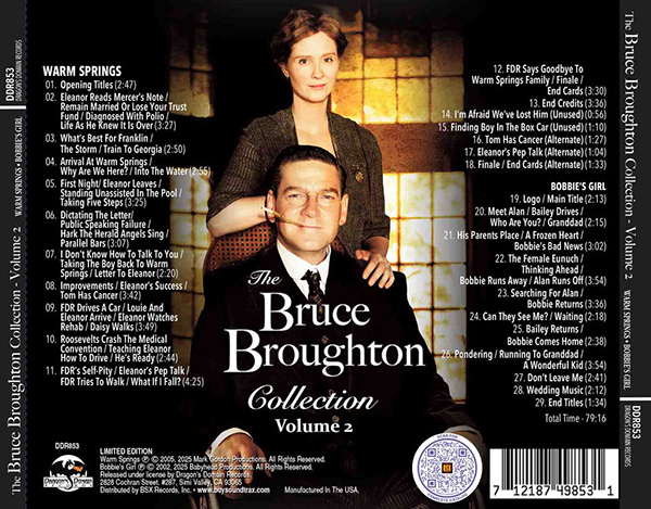 Dragon's Domain Records presents THE BRUCE BROUGHTON COLLECTION: VOL. 2, featuring music composed by Bruce Broughton for WARM SPRINGS and BOBBY'S GIRL. The music has been mastered by James Nelson at Digital Outland and the liner notes have been written by G.B. Kemner and Scott Davis.