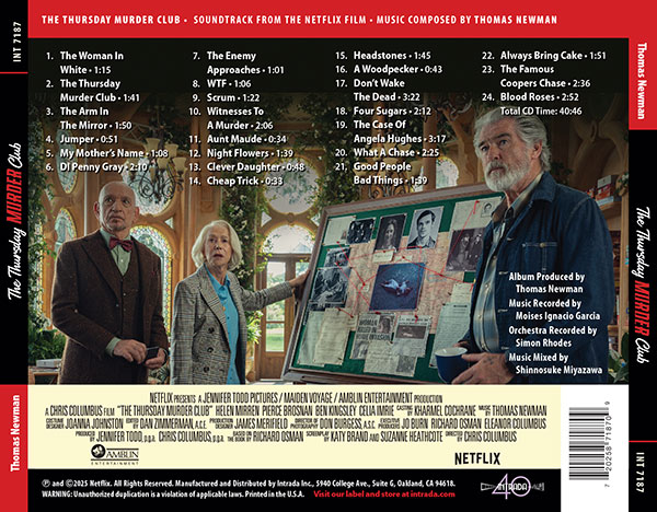 Intrada announces the CD release of Thomas Newman's score to Netflix's The Thursday Murder Club. Newman brings to the light-hearteded concept a delicate and quirky score as only he can deliver. Focused primarily on strings, piano and winds with occasional participation of the brass, the tone is warm and whimsical. But there's real murder and mystery here, so Newman's score plays into that aspect as well. The Club itself has its own theme for the dedication of the four friends to their club. This release mirrors the previously released 24-track digital edition, featuring 40 minutes of score produced by the composer.
